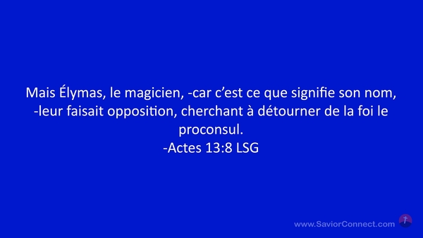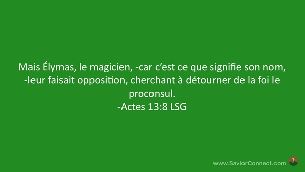 Mais Élymas, le magicien, -car c'est ce que signifie son nom, -leur faisait opposition, cherchant à détourner de la foi le proconsul. -Actes 13:8 LSG