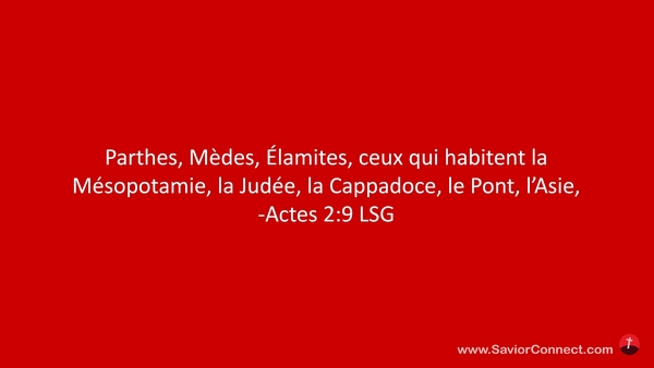 Parthes, Mèdes, Élamites, ceux qui habitent la Mésopotamie, la Judée, la Cappadoce, le Pont, l'Asie, -Actes 2:9 LSG