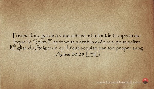 Prenez donc garde à vous-mêmes, et à tout le troupeau sur lequel le Saint-Esprit vous a établis évêques, pour paître l'Église du Seigneur, qu'il s'est acquise par son propre sang. -Actes 20:28 LSG