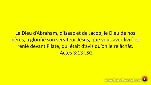 Le Dieu d'Abraham, d'Isaac et de Jacob, le Dieu de nos pères, a glorifié son serviteur Jésus, que vous avez livré et renié devant Pilate, qui était d'avis qu'on le relâchât. -Actes 3:13 LSG