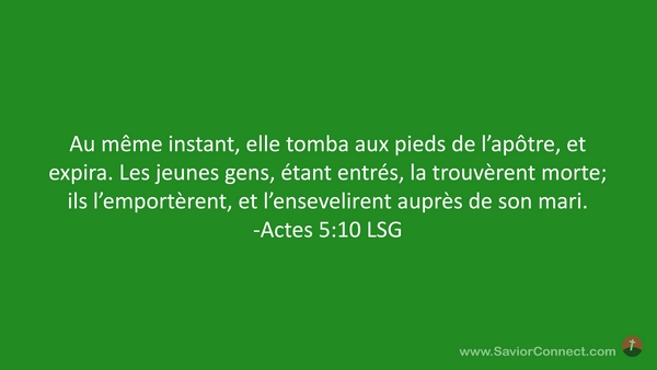 Au même instant, elle tomba aux pieds de l'apôtre, et expira. Les jeunes gens, étant entrés, la trouvèrent morte; ils l'emportèrent, et l'ensevelirent auprès de son mari. -Actes 5:10 LSG