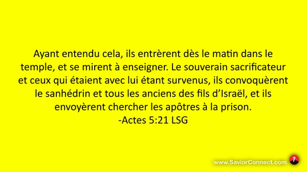 Ayant entendu cela, ils entrèrent dès le matin dans le temple, et se mirent à enseigner. Le souverain sacrificateur et ceux qui étaient avec lui étant survenus, ils convoquèrent le sanhédrin et tous les anciens des fils d'Israël, et ils envoyèrent chercher les apôtres à la prison. -Actes 5:21 LSG