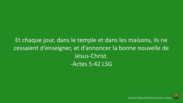 Et chaque jour, dans le temple et dans les maisons, ils ne cessaient d'enseigner, et d'annoncer la bonne nouvelle de Jésus-Christ. -Actes 5:42 LSG