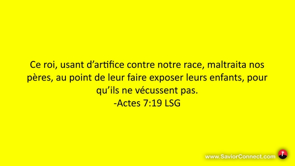 Ce roi, usant d'artifice contre notre race, maltraita nos pères, au point de leur faire exposer leurs enfants, pour qu'ils ne vécussent pas. -Actes 7:19 LSG