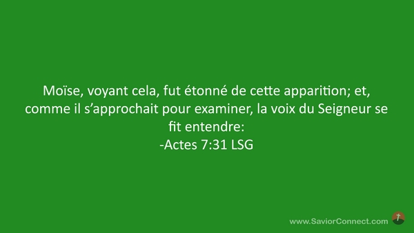 Moïse, voyant cela, fut étonné de cette apparition; et, comme il s'approchait pour examiner, la voix du Seigneur se fit entendre: -Actes 7:31 LSG