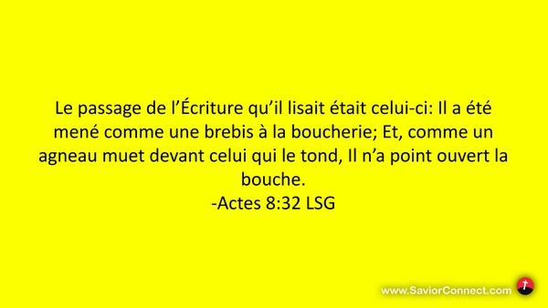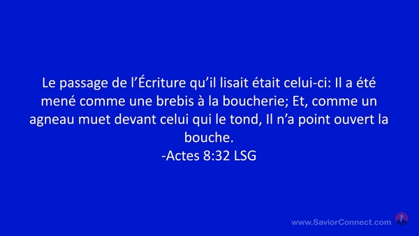 Le passage de l'Écriture qu'il lisait était celui-ci: Il a été mené comme une brebis à la boucherie; Et, comme un agneau muet devant celui qui le tond, Il n'a point ouvert la bouche. -Actes 8:32 LSG