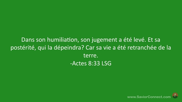 Dans son humiliation, son jugement a été levé. Et sa postérité, qui la dépeindra? Car sa vie a été retranchée de la terre. -Actes 8:33 LSG