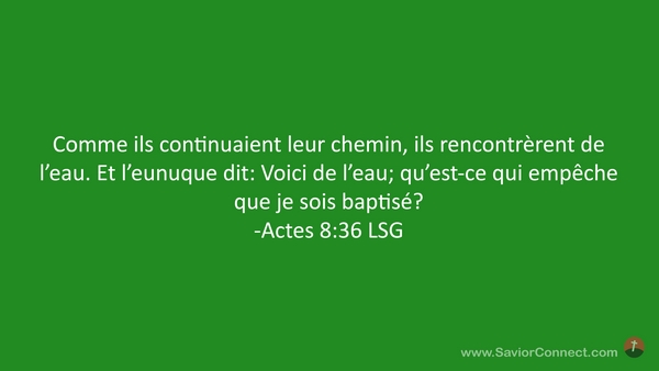 Comme ils continuaient leur chemin, ils rencontrèrent de l'eau. Et l'eunuque dit: Voici de l'eau; qu'est-ce qui empêche que je sois baptisé? -Actes 8:36 LSG