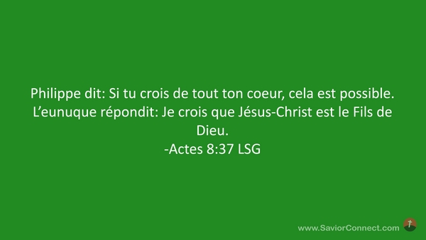 Philippe dit: Si tu crois de tout ton coeur, cela est possible. L'eunuque répondit: Je crois que Jésus-Christ est le Fils de Dieu. -Actes 8:37 LSG