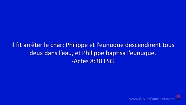 Il fit arrêter le char; Philippe et l'eunuque descendirent tous deux dans l'eau, et Philippe baptisa l'eunuque. -Actes 8:38 LSG
