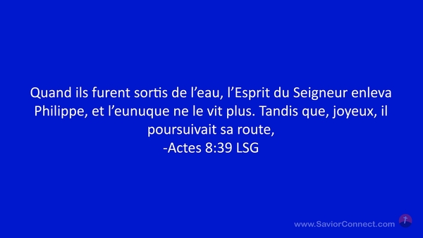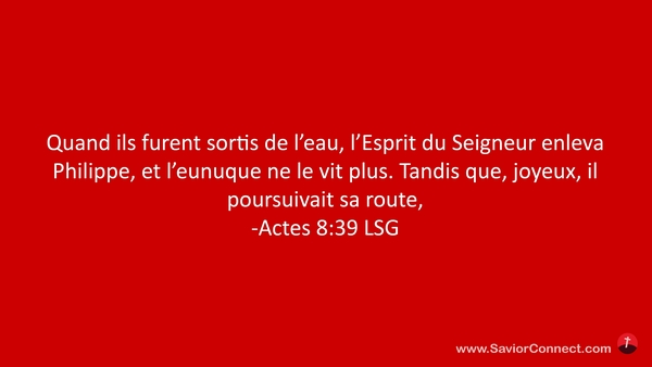 Quand ils furent sortis de l'eau, l'Esprit du Seigneur enleva Philippe, et l'eunuque ne le vit plus. Tandis que, joyeux, il poursuivait sa route, -Actes 8:39 LSG