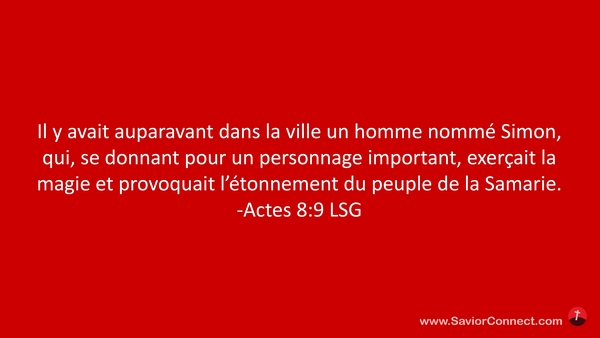 Il y avait auparavant dans la ville un homme nommé Simon, qui, se donnant pour un personnage important, exerçait la magie et provoquait l'étonnement du peuple de la Samarie. -Actes 8:9 LSG