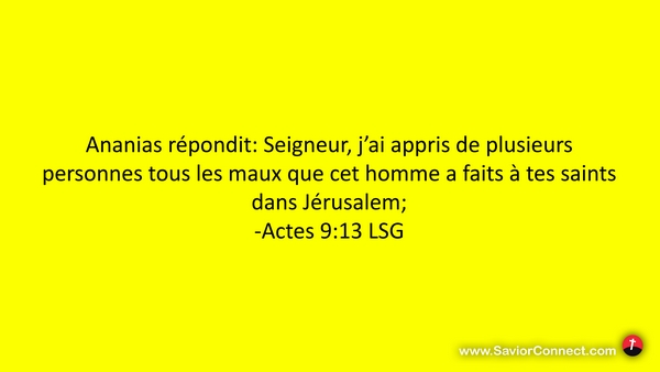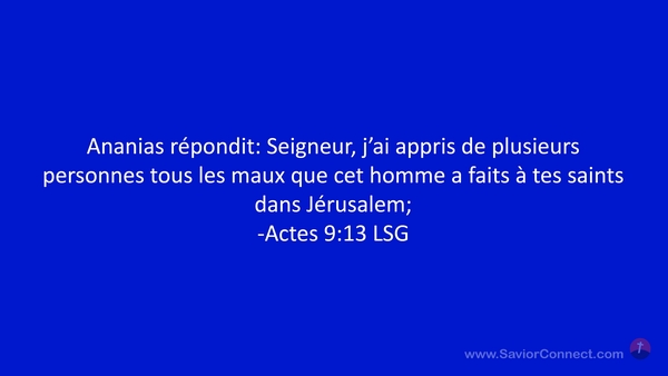 Ananias répondit: Seigneur, j'ai appris de plusieurs personnes tous les maux que cet homme a faits à tes saints dans Jérusalem; -Actes 9:13 LSG