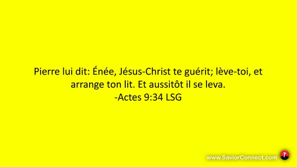 Pierre lui dit: Énée, Jésus-Christ te guérit; lève-toi, et arrange ton lit. Et aussitôt il se leva. -Actes 9:34 LSG