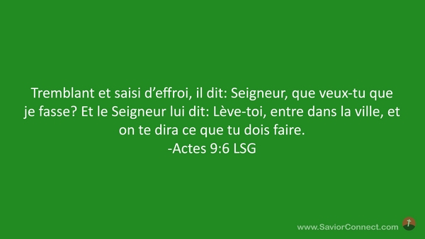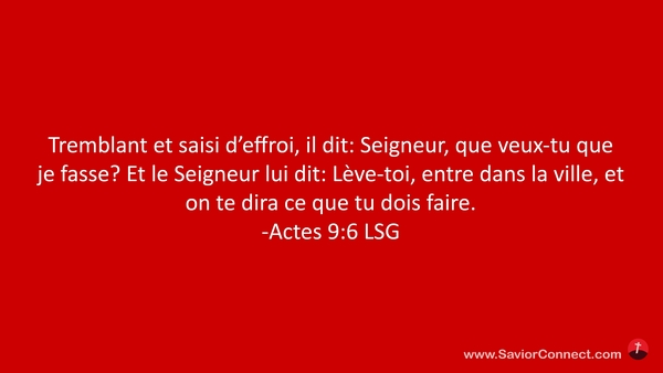 Tremblant et saisi d'effroi, il dit: Seigneur, que veux-tu que je fasse? Et le Seigneur lui dit: Lève-toi, entre dans la ville, et on te dira ce que tu dois faire. -Actes 9:6 LSG