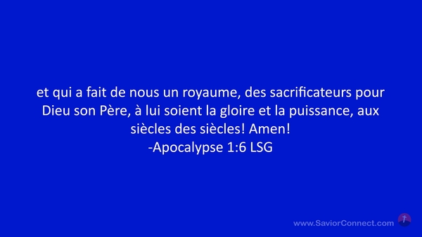 et qui a fait de nous un royaume, des sacrificateurs pour Dieu son Père, à lui soient la gloire et la puissance, aux siècles des siècles! Amen! -Apocalypse 1:6 LSG