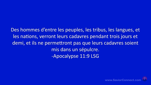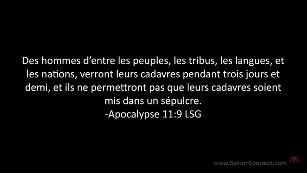 Des hommes d'entre les peuples, les tribus, les langues, et les nations, verront leurs cadavres pendant trois jours et demi, et ils ne permettront pas que leurs cadavres soient mis dans un sépulcre. -Apocalypse 11:9 LSG