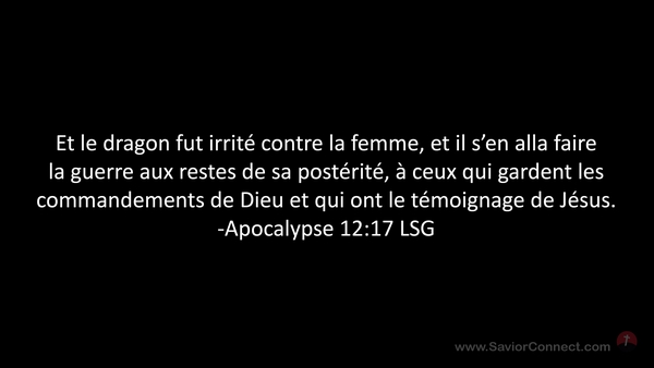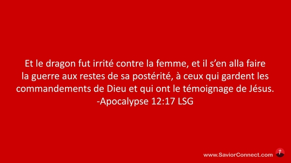 Et le dragon fut irrité contre la femme, et il s'en alla faire la guerre aux restes de sa postérité, à ceux qui gardent les commandements de Dieu et qui ont le témoignage de Jésus. -Apocalypse 12:17 LSG