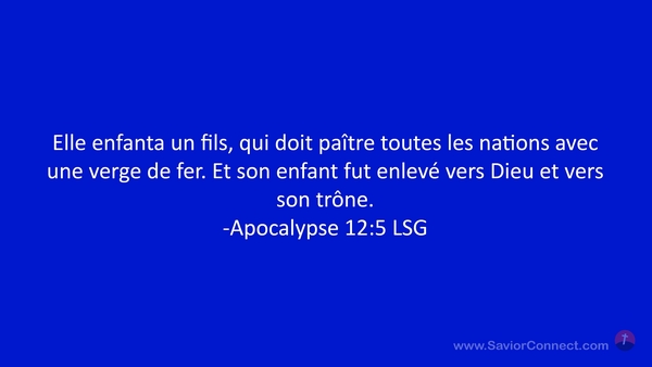 Elle enfanta un fils, qui doit paître toutes les nations avec une verge de fer. Et son enfant fut enlevé vers Dieu et vers son trône. -Apocalypse 12:5 LSG
