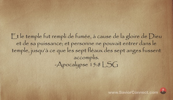 Et le temple fut rempli de fumée, à cause de la gloire de Dieu et de sa puissance; et personne ne pouvait entrer dans le temple, jusqu'à ce que les sept fléaux des sept anges fussent accomplis. -Apocalypse 15:8 LSG