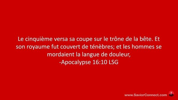 Le cinquième versa sa coupe sur le trône de la bête. Et son royaume fut couvert de ténèbres; et les hommes se mordaient la langue de douleur, -Apocalypse 16:10 LSG