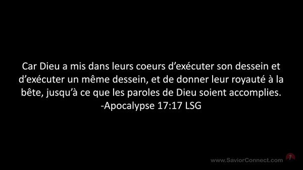 Car Dieu a mis dans leurs coeurs d'exécuter son dessein et d'exécuter un même dessein, et de donner leur royauté à la bête, jusqu'à ce que les paroles de Dieu soient accomplies. -Apocalypse 17:17 LSG