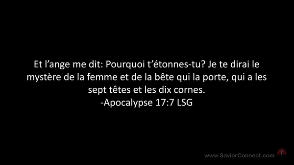 Et l'ange me dit: Pourquoi t'étonnes-tu? Je te dirai le mystère de la femme et de la bête qui la porte, qui a les sept têtes et les dix cornes. -Apocalypse 17:7 LSG