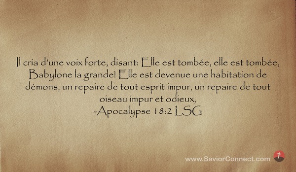 Il cria d'une voix forte, disant: Elle est tombée, elle est tombée, Babylone la grande! Elle est devenue une habitation de démons, un repaire de tout esprit impur, un repaire de tout oiseau impur et odieux, -Apocalypse 18:2 LSG