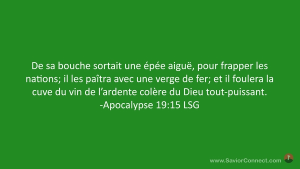 De sa bouche sortait une épée aiguë, pour frapper les nations; il les paîtra avec une verge de fer; et il foulera la cuve du vin de l'ardente colère du Dieu tout-puissant. -Apocalypse 19:15 LSG