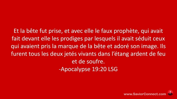Et la bête fut prise, et avec elle le faux prophète, qui avait fait devant elle les prodiges par lesquels il avait séduit ceux qui avaient pris la marque de la bête et adoré son image. Ils furent tous les deux jetés vivants dans l'étang ardent de feu et de soufre. -Apocalypse 19:20 LSG