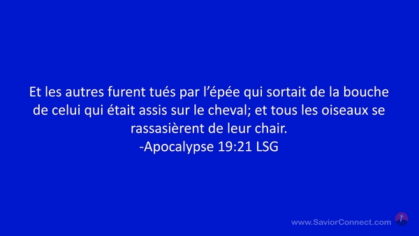 Et les autres furent tués par l'épée qui sortait de la bouche de celui qui était assis sur le cheval; et tous les oiseaux se rassasièrent de leur chair. -Apocalypse 19:21 LSG