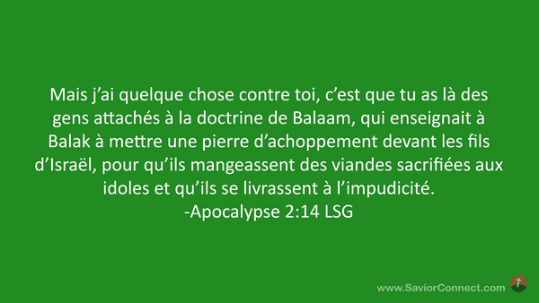 Mais j'ai quelque chose contre toi, c'est que tu as là des gens attachés à la doctrine de Balaam, qui enseignait à Balak à mettre une pierre d'achoppement devant les fils d'Israël, pour qu'ils mangeassent des viandes sacrifiées aux idoles et qu'ils se livrassent à l'impudicité. -Apocalypse 2:14 LSG