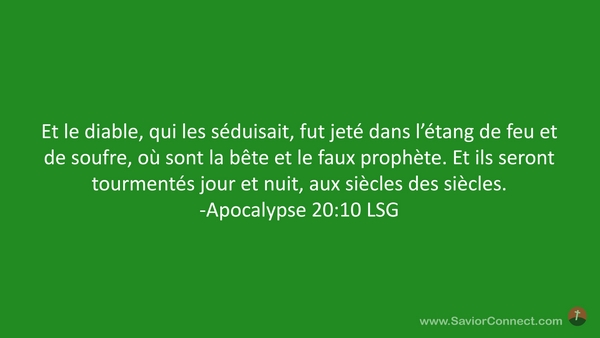 Et le diable, qui les séduisait, fut jeté dans l'étang de feu et de soufre, où sont la bête et le faux prophète. Et ils seront tourmentés jour et nuit, aux siècles des siècles. -Apocalypse 20:10 LSG