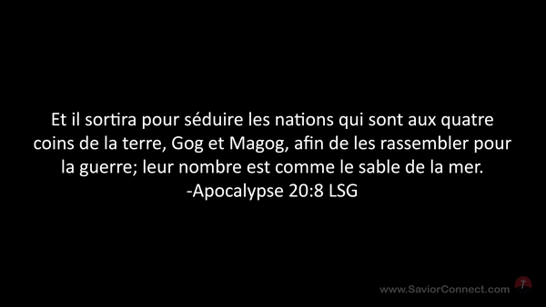Et il sortira pour séduire les nations qui sont aux quatre coins de la terre, Gog et Magog, afin de les rassembler pour la guerre; leur nombre est comme le sable de la mer. -Apocalypse 20:8 LSG