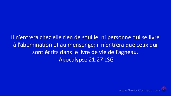 Il n'entrera chez elle rien de souillé, ni personne qui se livre à l'abomination et au mensonge; il n'entrera que ceux qui sont écrits dans le livre de vie de l'agneau. -Apocalypse 21:27 LSG