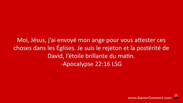 Moi, Jésus, j'ai envoyé mon ange pour vous attester ces choses dans les Églises. Je suis le rejeton et la postérité de David, l'étoile brillante du matin. -Apocalypse 22:16 LSG