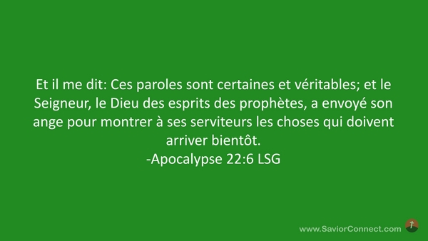 Et il me dit: Ces paroles sont certaines et véritables; et le Seigneur, le Dieu des esprits des prophètes, a envoyé son ange pour montrer à ses serviteurs les choses qui doivent arriver bientôt. -Apocalypse 22:6 LSG