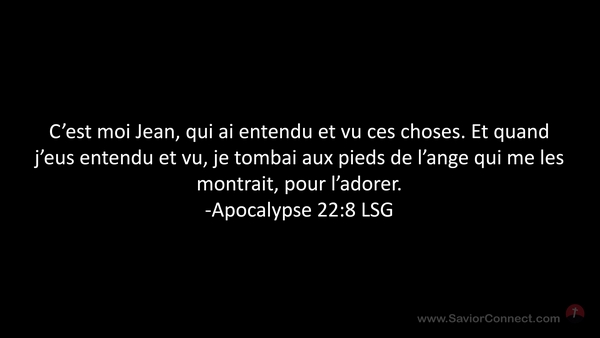C'est moi Jean, qui ai entendu et vu ces choses. Et quand j'eus entendu et vu, je tombai aux pieds de l'ange qui me les montrait, pour l'adorer. -Apocalypse 22:8 LSG