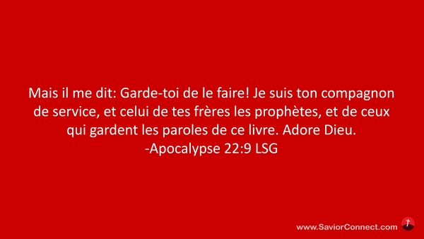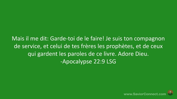 Mais il me dit: Garde-toi de le faire! Je suis ton compagnon de service, et celui de tes frères les prophètes, et de ceux qui gardent les paroles de ce livre. Adore Dieu. -Apocalypse 22:9 LSG