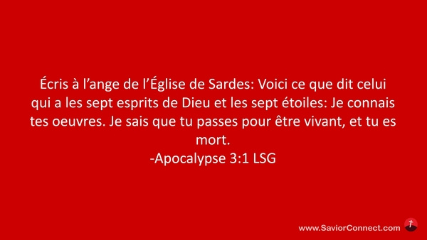 Écris à l'ange de l'Église de Sardes: Voici ce que dit celui qui a les sept esprits de Dieu et les sept étoiles: Je connais tes oeuvres. Je sais que tu passes pour être vivant, et tu es mort. -Apocalypse 3:1 LSG
