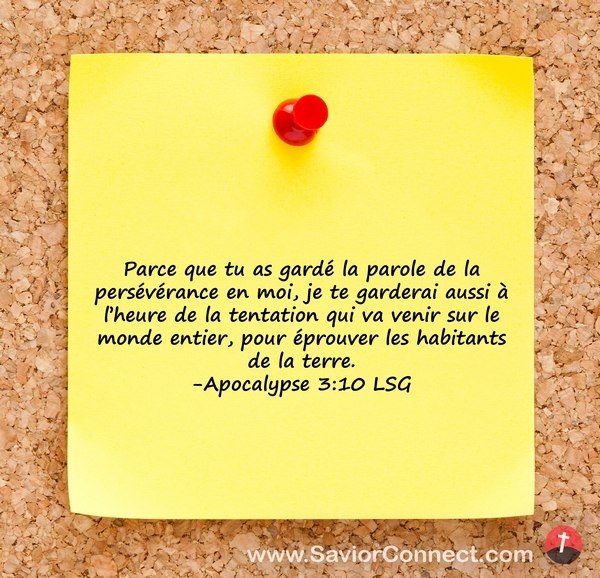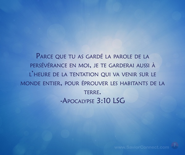 Parce que tu as gardé la parole de la persévérance en moi, je te garderai aussi à l'heure de la tentation qui va venir sur le monde entier, pour éprouver les habitants de la terre. -Apocalypse 3:10 LSG