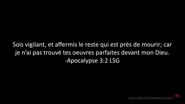 Sois vigilant, et affermis le reste qui est près de mourir; car je n'ai pas trouvé tes oeuvres parfaites devant mon Dieu. -Apocalypse 3:2 LSG