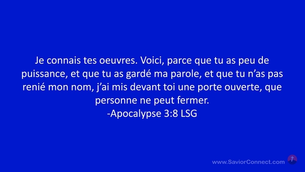 Je connais tes oeuvres. Voici, parce que tu as peu de puissance, et que tu as gardé ma parole, et que tu n'as pas renié mon nom, j'ai mis devant toi une porte ouverte, que personne ne peut fermer. -Apocalypse 3:8 LSG