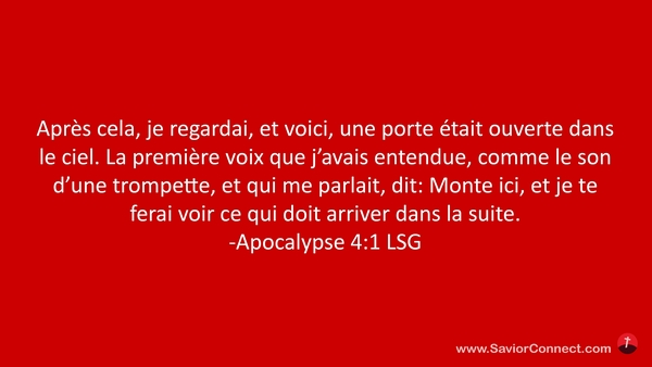 Après cela, je regardai, et voici, une porte était ouverte dans le ciel. La première voix que j'avais entendue, comme le son d'une trompette, et qui me parlait, dit: Monte ici, et je te ferai voir ce qui doit arriver dans la suite. -Apocalypse 4:1 LSG