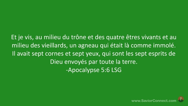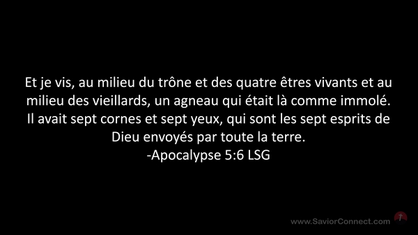 Et je vis, au milieu du trône et des quatre êtres vivants et au milieu des vieillards, un agneau qui était là comme immolé. Il avait sept cornes et sept yeux, qui sont les sept esprits de Dieu envoyés par toute la terre. -Apocalypse 5:6 LSG