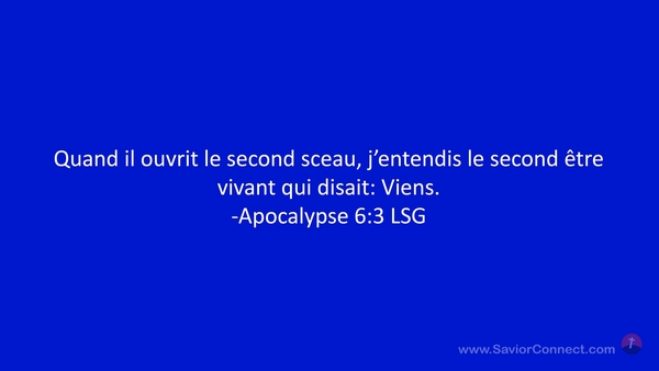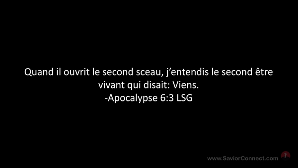 Quand il ouvrit le second sceau, j'entendis le second être vivant qui disait: Viens. -Apocalypse 6:3 LSG