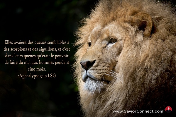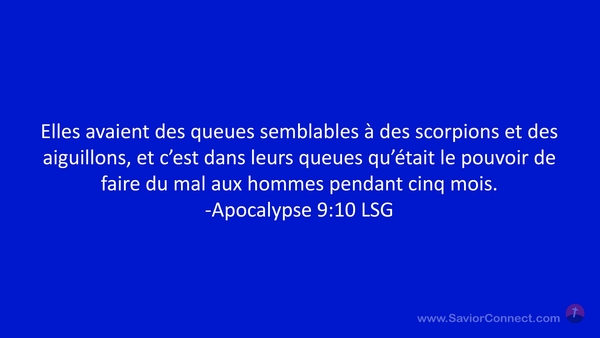Elles avaient des queues semblables à des scorpions et des aiguillons, et c'est dans leurs queues qu'était le pouvoir de faire du mal aux hommes pendant cinq mois. -Apocalypse 9:10 LSG