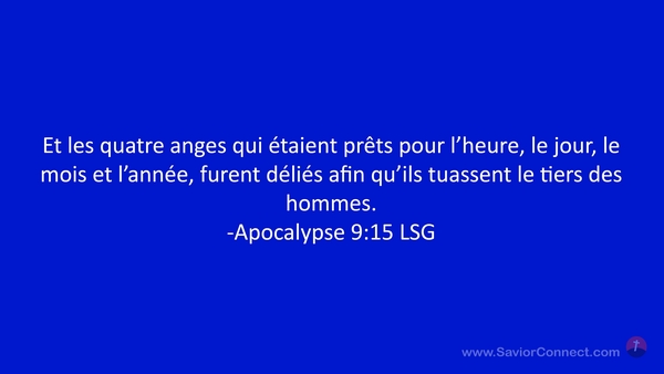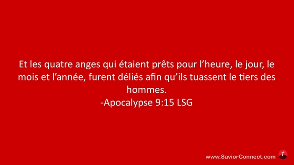 Et les quatre anges qui étaient prêts pour l'heure, le jour, le mois et l'année, furent déliés afin qu'ils tuassent le tiers des hommes. -Apocalypse 9:15 LSG