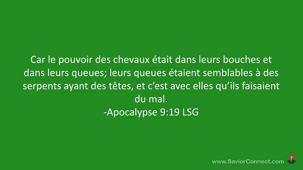 Car le pouvoir des chevaux était dans leurs bouches et dans leurs queues; leurs queues étaient semblables à des serpents ayant des têtes, et c'est avec elles qu'ils faisaient du mal. -Apocalypse 9:19 LSG