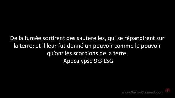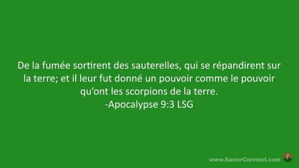 De la fumée sortirent des sauterelles, qui se répandirent sur la terre; et il leur fut donné un pouvoir comme le pouvoir qu'ont les scorpions de la terre. -Apocalypse 9:3 LSG